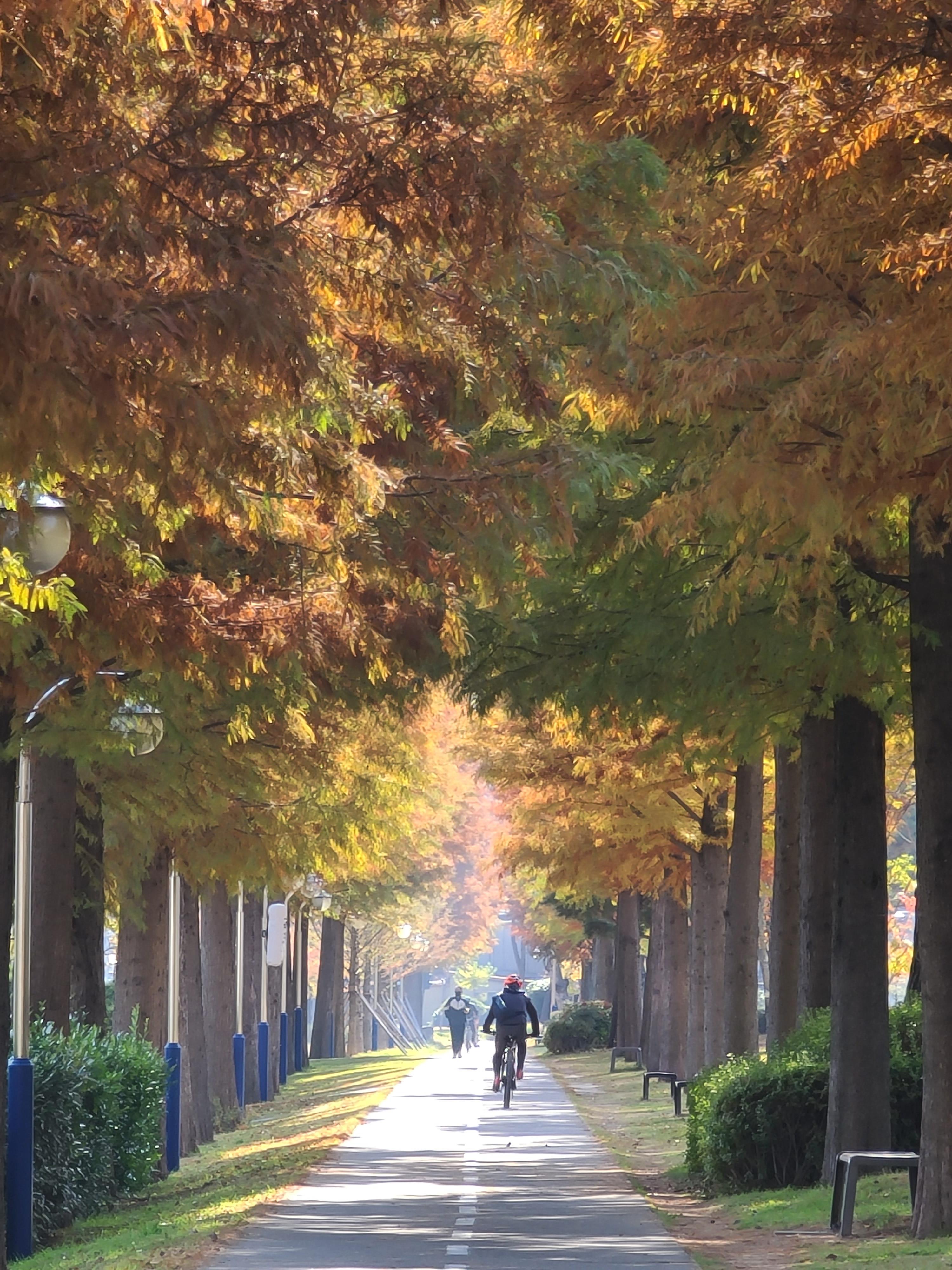-방문일 : 2021,11,14,일 포항철길숲 수도산 관음사 부근 모습 은행나무가로수길이 짧은 거리지만 따스한 햇살에 곱게 익어 갑니다. 포항철길숲 메타세콰이어 숲 ▼ 드뎌 포항 우현동 메타세콰이어 숲길에 도착하였습니다. 포항시내 군데 군데 메타세콰이어 나무들이 있지만 여기처럼 멋진 모습을 보여 주는 곳은 없습니다. 포항에서 메타숲으로 가장 핫한 곳이지요 물론 유명한 전국의 메타숲에 비하면 초라할지 모르지만 우리 퐝에서는 최곱니다요~ㅎ 바람없고 따스한 하늘 높은 날 많은 시민들이 산책나오셨네요 이 길은 유성여고 앞까지 이어지는데 큰나무 숲이 터널을 이루는 멋진 숲길입니다.