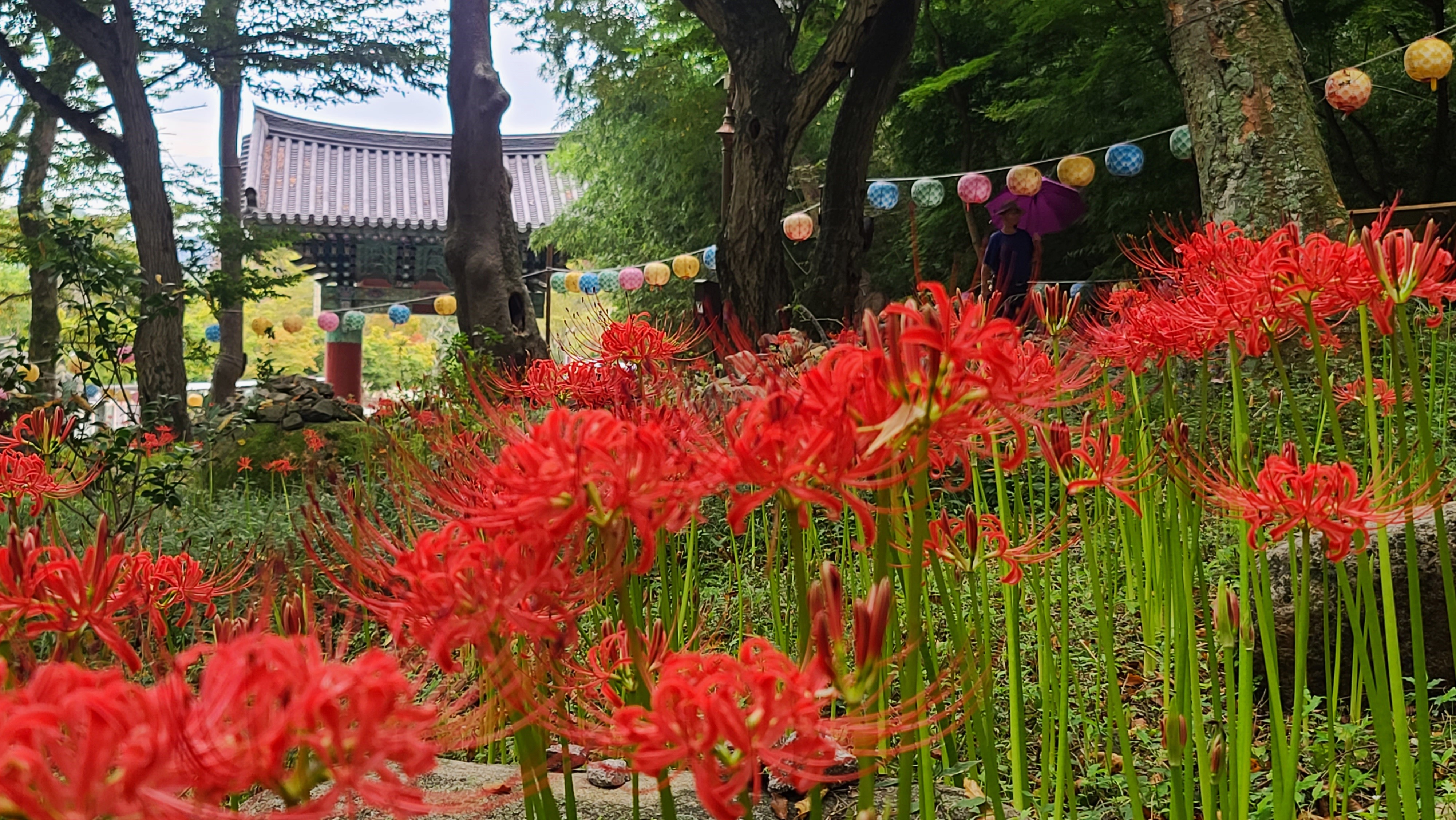 태풍 13호 버링카가 중국 상하이에서 갑자기 급선회하여 우리나라 서남해를 향한다고 하는 뉴스에 서둘러 경주 꽃무릇 탐방에 나셨답니다.꽃무릇은 비바람에 약하기 때문이지요.경주의 꽃무릇은 토함산자연휴양림과 기림사가 유명하지요.올해는 가뭄과 폭염으로 꽃무릇의 개화시기가 많이 늦네요,절정시기는 토함산은 지금,기림사는 다음주입니다.예상대로 기림사의 꽃무릇은 아직 60% 수준입니다.오랜만에 들린 기림사입니다. ♣탐방일 : 2024,9,20,금,오전 주차장 부도탑 주변 꽃무릇▼ 일주문 주변 꽃무릇▼ 천년고찰 기림사의 꽃무릇은 일주문 주변 노거수 아래에 군락을 이루고 있습니다.