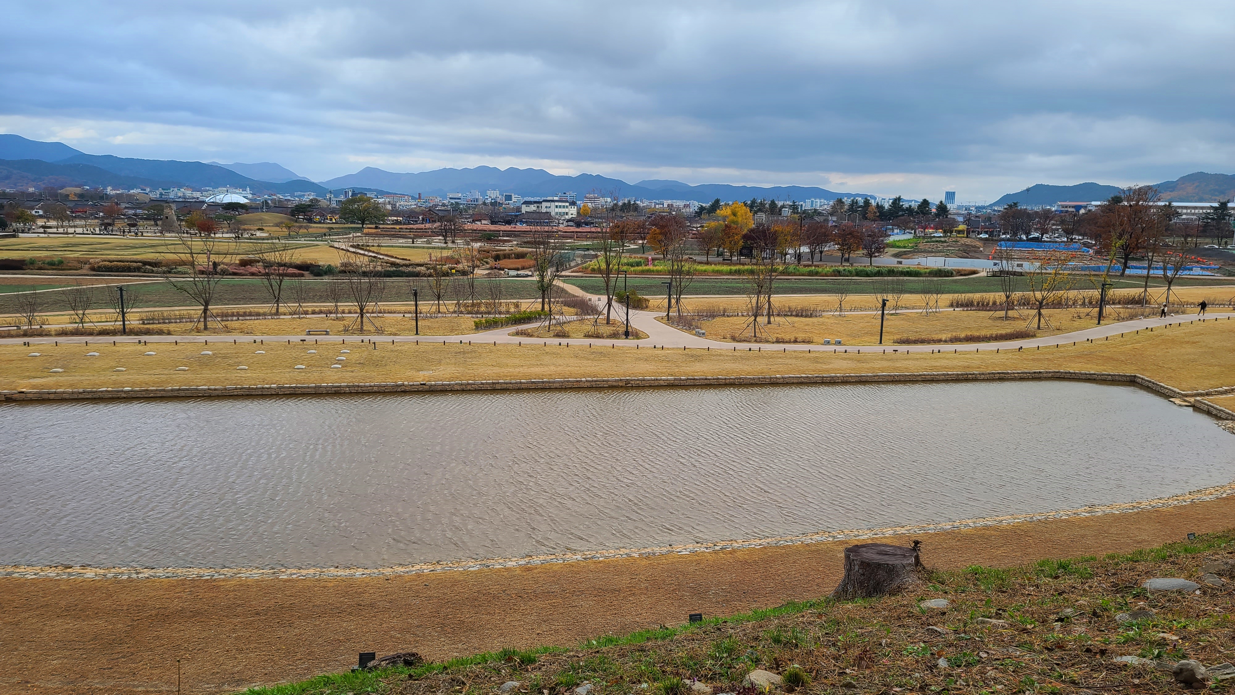 유적 발굴이 끝난 곳은 이렇게 연못으로 변했네요.그리고 반월성 언덕가장자리 둔덕에 벚나무는