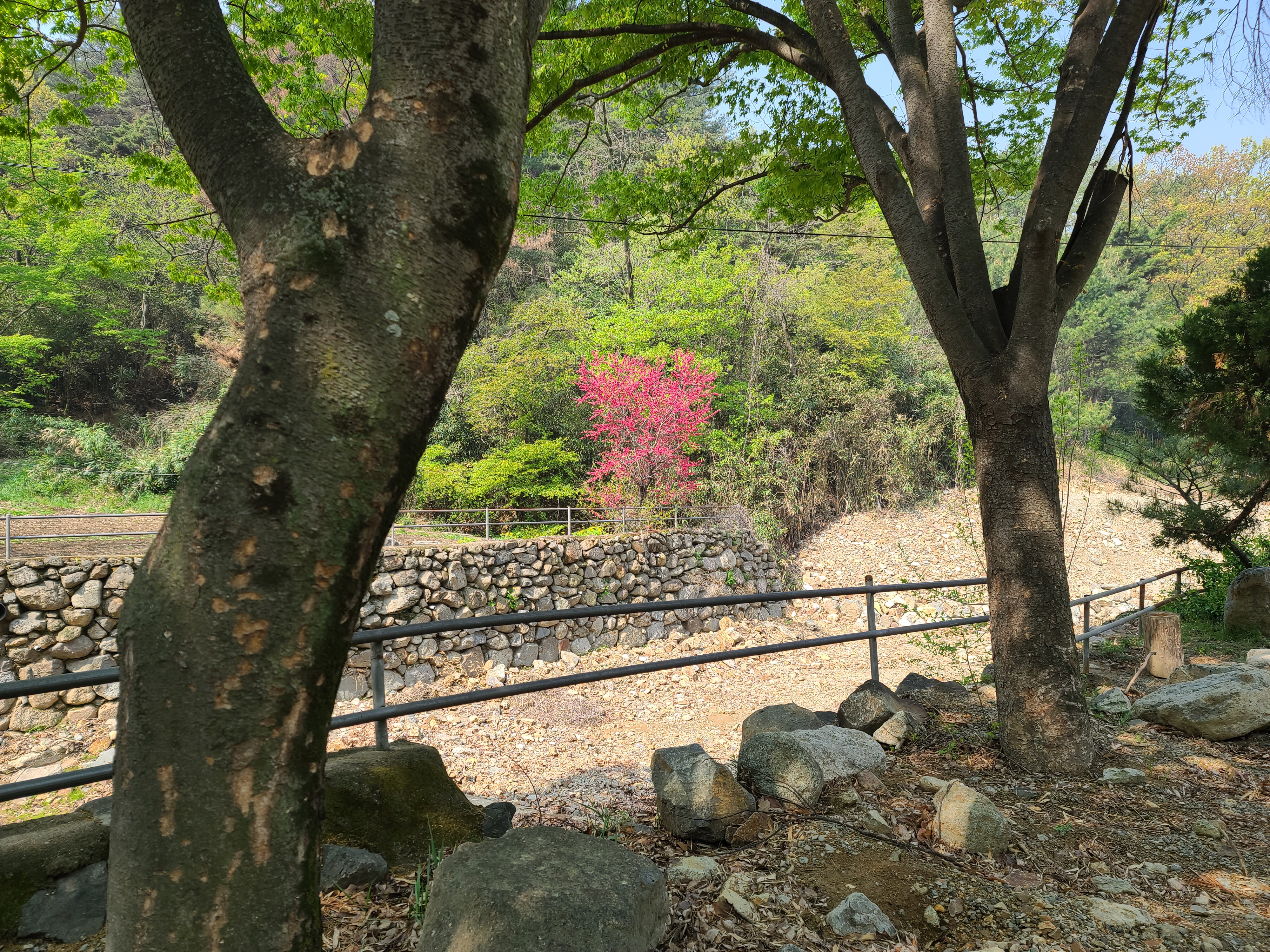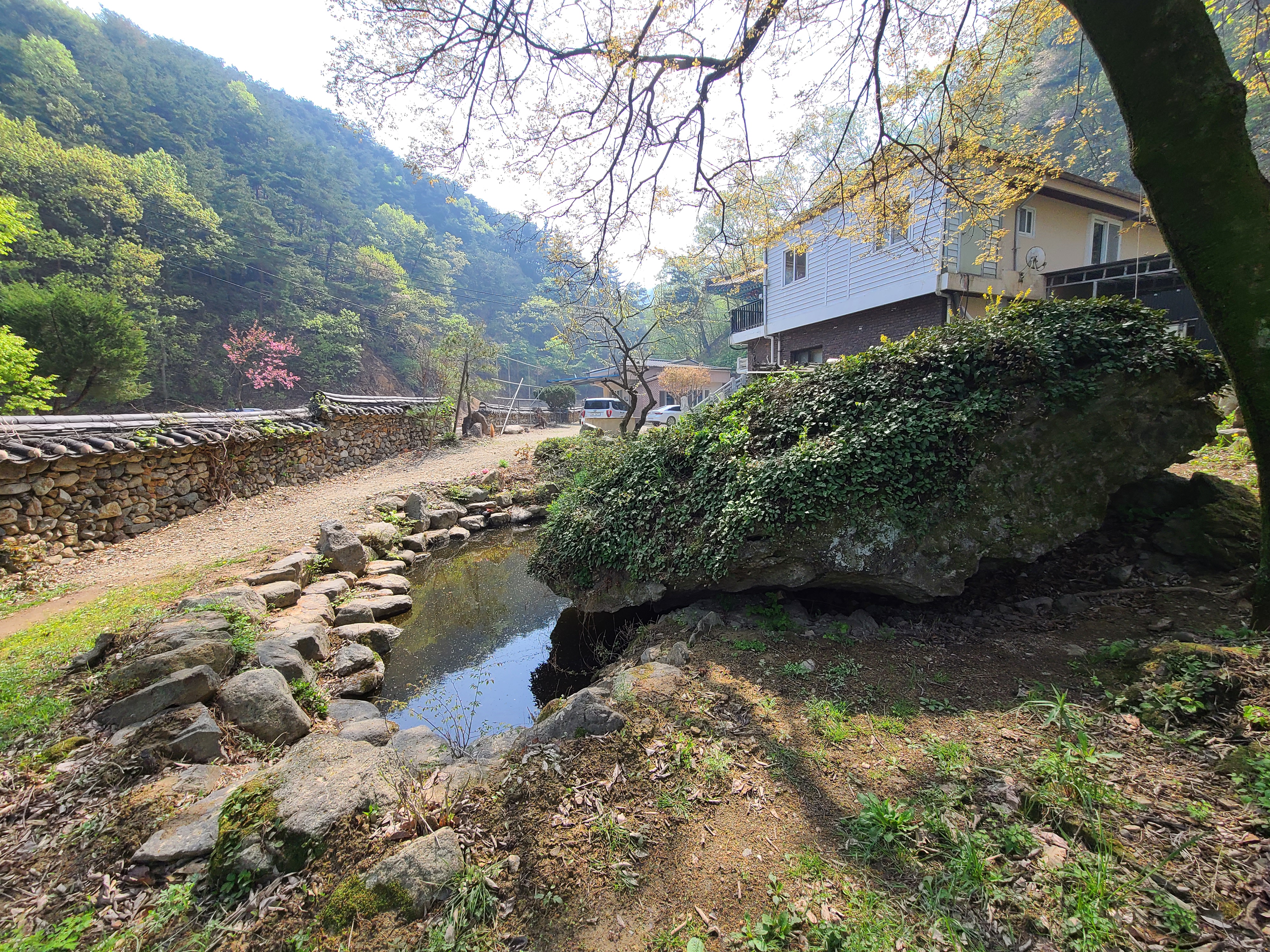 계곡 건너 복사꽃나무가 눈길을 끕니다.